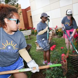 Together, the 2015 GM Student Corps spread 999 yards of mulch; planted 700 flowers and trees; moved 61 yards of soil and stone; applied 246 gallons of paint and stain; and laid 750 feet of landscape edging. Equipment included two front loaders, 278 brushes and rollers and 300 feet of hose.
