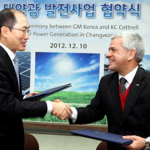 CHANGWON, South Korea, December 10, 2012 /3BL Media/ – General Motors announced today that its Changwon Assembly plant, home of the brand new Chevrolet Spark and Spark EV, has reached an agreement with renewable energy company KC Cottrell to build a three-megawatt solar installation on the plant’s rooftop.
