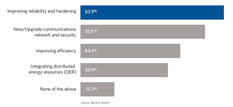 Grid modification planning for utilities has meant taking on a lot of new technology, especially in the segments of grid operation that have become popular for improvement. A little more than half of respondents indicated electrical asset and automation upgrades are getting the most attention, followed by network and security communications systems upgrades (55 percent).