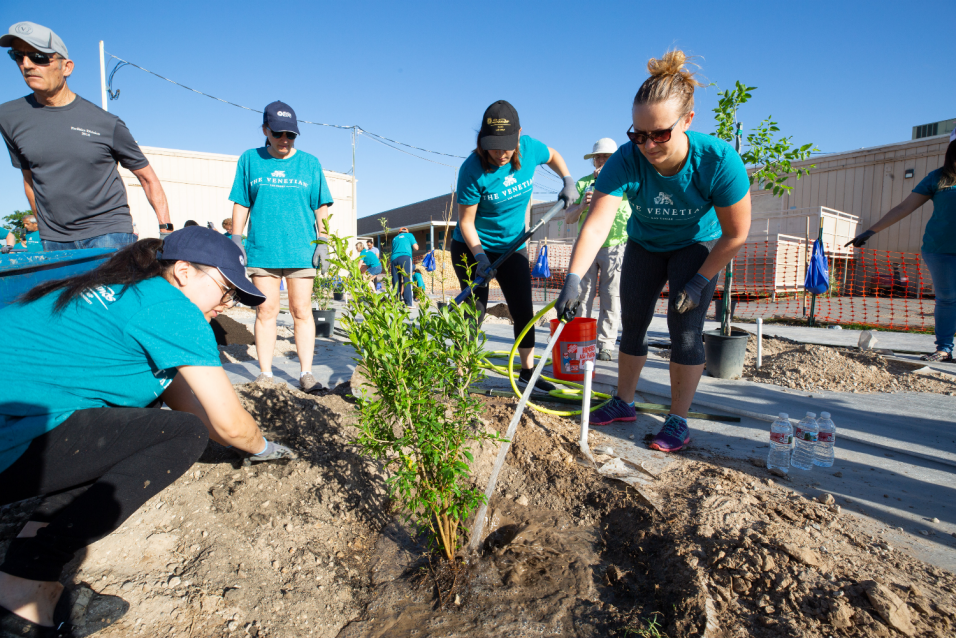 Last year, The Venetian, The Palazzo, and Sands Expo Las Vegas partnered with local non-profit conservation organization Green Our Planet to build six garden beds, equipped with drip irrigation lines, composter bins, and a garden shed, for a local elementary school. This May, the partnership expanded, and more than 600 Team Members came together to build an additional 12 gardens for various schools throughout Las Vegas. Trees were planted, garden beds were prepped, and new soil was laid, for children of all ages to plant and grow fresh veggies and fruits. The school gardens are used as natural laboratories, and help curious students learn about STEAM (science, technology, engineering, art and math), nutrition and conservation, through project-based, hands-on learning.