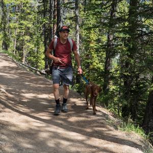 All of the dog owners bring a sturdy leash for their pets so they have good control of them, and Holland likes to bring a pair of cotton socks for Bruno’s pads in case the ground gets too hot. He uses what he calls the seven-second test: Place the back of your hand on the ground for seven seconds. If it’s too hot for your hand, “it’s too hot for your pup,” he says. On warmer days, he checks every 30 minutes throughout the hike.