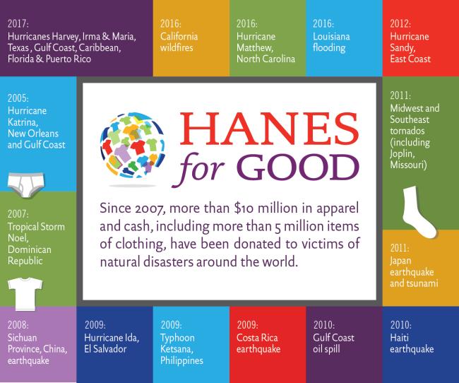 To-date, Hanes has donated more than 2 million pair of underwear, socks, t-shirts, and fleece to assist victims of Hurricanes Harvey, Irma and Maria in Texas, Florida, Puerto Rico and Elsewhere.