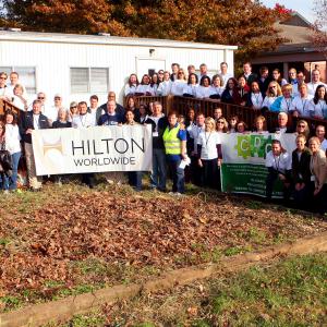 Today marked the official kick off of the inaugural Hilton Worldwide Global Week of Service as Christopher J. Nassetta, president and chief executive officer, Hilton Worldwide and more than 100 Team Members from the Global Headquarters in McLean, VA served children and families at the ACCA Child Development Center in Fairfax, VA. Team Members spent the morning installing a hanging system for showcasing art from students, building sturdy storage closets for the classrooms, beautifying classrooms and the outside playground - all to help make the center a safer and more productive learning environment. This service project is the first of more than 300 global projects scheduled throughout the week as Team Members demonstrate their commitment to Travel with Purpose.