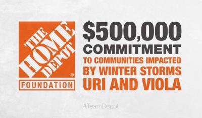 In response to the recent winter storms devastating the nation, The Home Depot Foundation announced today that it is committing up to $500,000 to aid with immediate relief efforts and short- and long-term recovery for communities impacted by historic winter storms, Uri and Viola. This incremental commitment is in addition to the Foundation’s annual grants of $3.6 million to disaster relief national nonprofit partners, bringing the current total commitment for 2021 to $4.1 million.