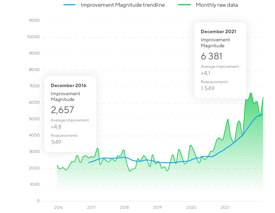 Improvement magnitude is calculated by multiplying the number of reassessed companies in a given time period by the average score improvement in those scorecards during the same time period. As illustrated in the below graph, this figure has nearly tripled since 2016, with a rapid increase starting in mid-2020.