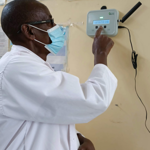 In the next image, we see the base station that collects data from the sensors to alert clinic workers with instant fault information for technicians to act on. It also transmits details to a central service for analytical review.
