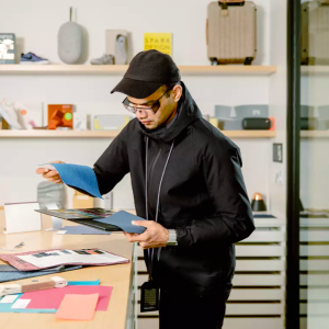 A sustainable HP notebook, no matter what materials it’s made from, needs to look and feel like HP made it, says Sandie Cheng, Global CMF Director. The CMF (colors, materials, finishes) library holds thousands of fabric swatches, colored tiles, and paint chips and samples, which Cheng uses as inspiration for the look and feel of fine details such as the touch pad on a laptop, the smooth glide of a hinge, or the sparkle of the HP logo peeking through a laser-etched cutout.