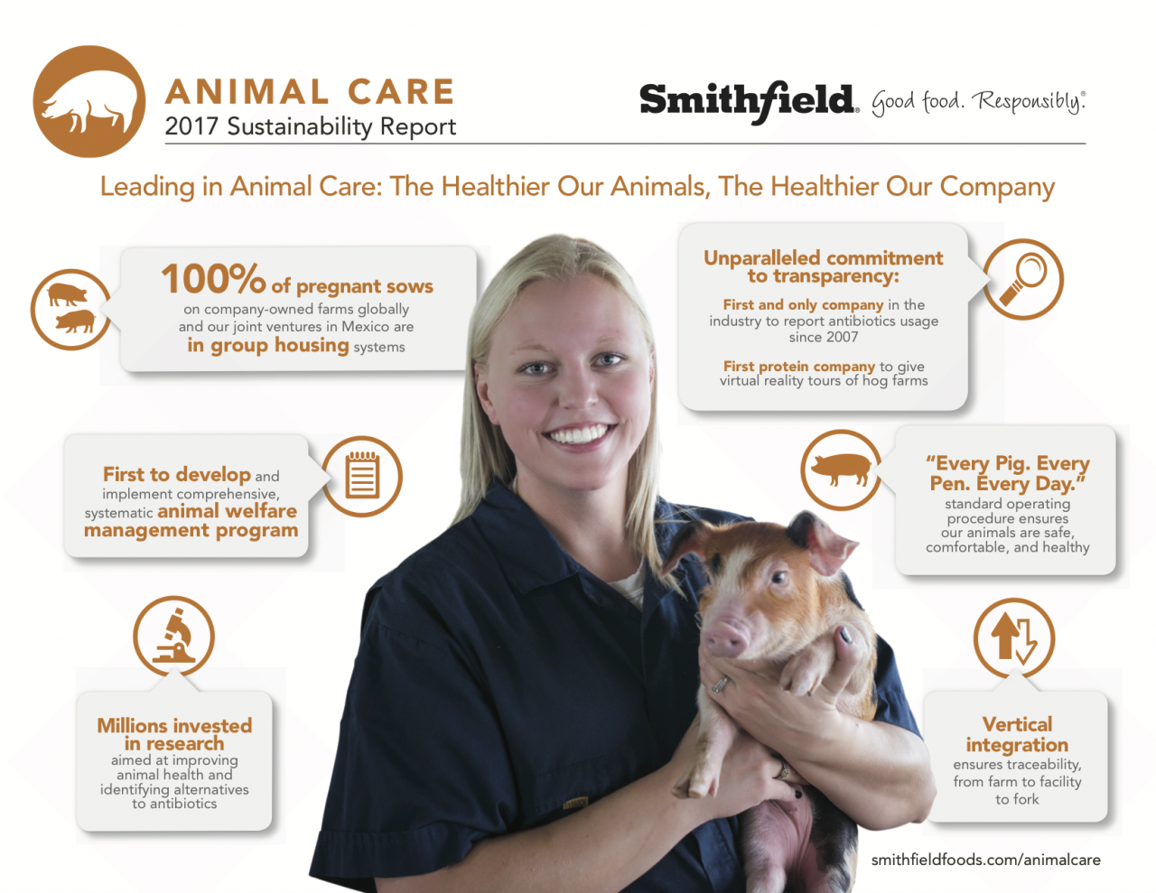 Learn more about Smithfield’s industry-leading approach to keeping its animals safe, comfortable, and healthy in its 2017 Sustainability Report at smithfieldfoods.com/animalcare