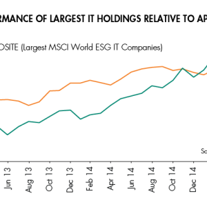 We can demonstrate the company-specific risk inherent in the Index construction methodology by looking at the information technology (IT) sector. In the MSCI World Index, Apple (1.9%) has the largest market capitalisation in the Index’s total universe, and therefore in the IT sector as well. However, it has been omitted from the MSCI World ESG Index as there are significant concerns with regard to: