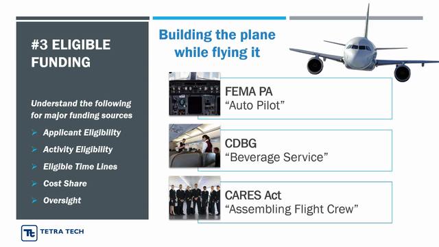 In this 30-minute webinar, Tetra Tech’s emergency management experts focused on the main sources of federal funding for costs associated with COVID-19 response and recovery efforts for local government entities. Our experts provide a general overview of the opportunities and limitations presented under the Federal Emergency Management Agency (FEMA) Public Assistance Program, Coronavirus Aid, Relief, and Economic Security Act (CARES Act), and changes to HUD’s 2019 and 2020 Community Development Block Grant (CDBG) funding, including the new Community Development Block Grant Coronavirus Response Supplement (CDBG-CV) program.