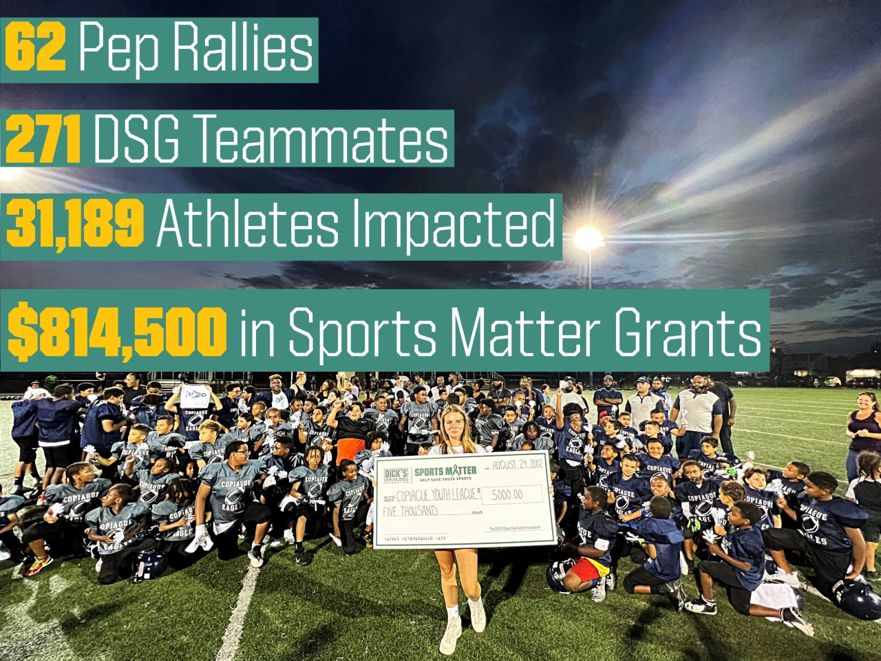 From mid-August though mid-September, DICK'S stores and community marketing managers nationwide surprised youth athletes with an epic run of pep rallies. This 30 days of giving was part of The DICK’S Foundation’s $6 million Sports Matter Community Grant Program, which enables our stores, distribution centers and community marketing managers to choose a local youth sports organization in need of support.