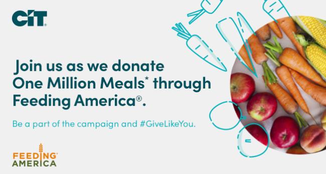 “This Giving Tuesday, we’re excited to launch our partnership with Feeding America and invite our customers, followers and employees to help us direct one million meals among three great programs,” said CIT Chief Marketing and Communications Officer Gina Proia.