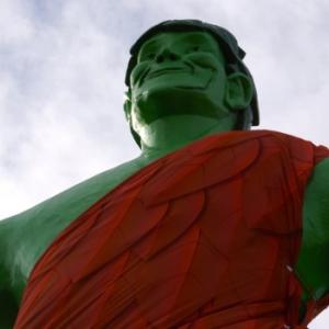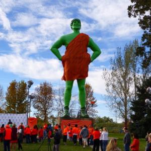 Since orange is the designated color of bullying prevention, Green Giant thought it would be fitting to attach a 25-foot, 35-pound toga – made from 100 percent recycled print fabric – to the 55-foot tall statue.