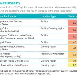 Thus, we partnered with The Nature Conservancy (TNC) to formulate and implement our collaborative global water stewardship strategy. In 2012, we completed a global water risk assessment of all General Mills plants and growing regions in partnership with TNC. These assessments build on our supply chain risk analysis work with the World Wildlife Fund from 2010, giving us a clear picture of the most at-risk watersheds within our supply chain and allowing us to develop sustainable strategies for improvement. And today, we are working with TNC to conduct deep analyses of our most at-risk and material watersheds in the world.
