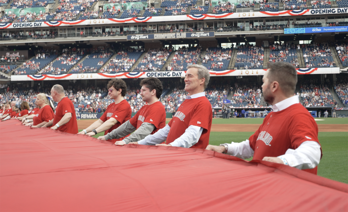 KeyBank’s cherished partnership with the Cleveland Guardians was on full display on Friday, April 3, as more than 200 KeyBank teammates stepped onto the field ahead of the team’s home opener, helping to hold the American flag during the pregame ceremony.