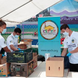 AEG’s LA Galaxy and Herbalife Nutrition recently teamed up with A Place Called Home (APCH) to pack and distribute food for families in need at a Family Resource Depot in the greater Los Angeles area on Wednesday, May 27. In conjunction with the LA Galaxy Foundation, LA Galaxy Players Daniel Steres, Rolf Feltscher, Joe Corona, assistant coach Dominic Kinnear and Cozmo joined volunteers at A Place Called Home to pack and deliver the food.