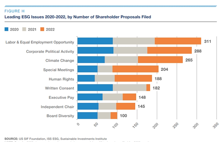 According to the 2022 Trends Report, from 2020 through the first half of 2022, 154 institutional investors and 70 investment managers collectively controlling nearly $3.0 trillion in assets at the start of 2022 filed or co-filed shareholder resolutions on environmental, social or governance (ESG) issues. Investors also focused on disclosure and management of corporate political spending and lobbying.