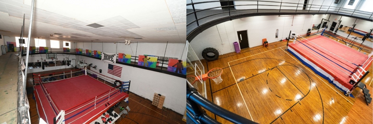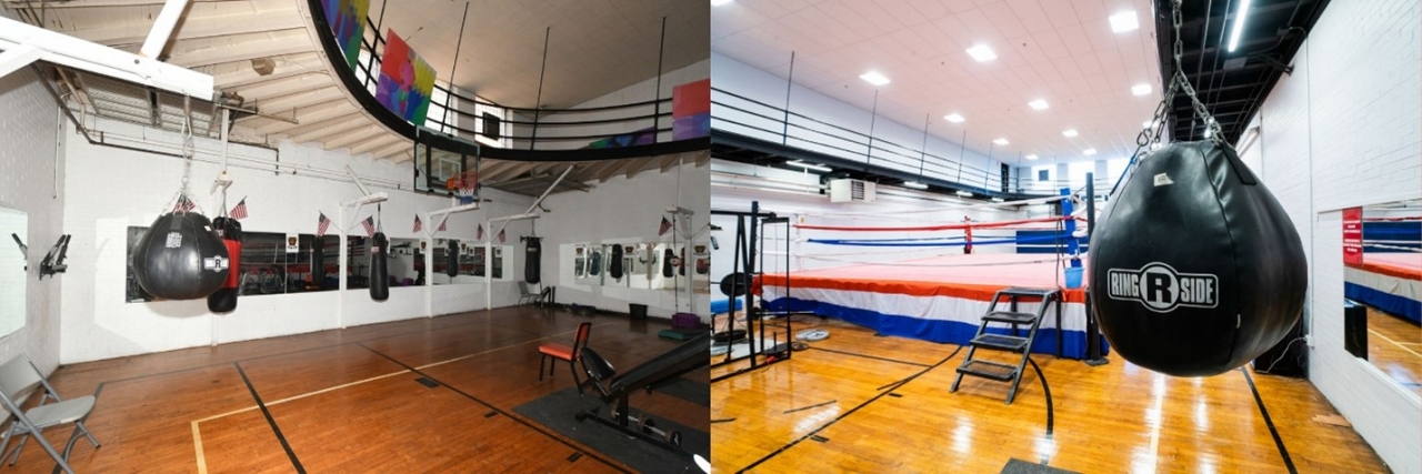 Before, left, and after the renovation of the boxing gym area.