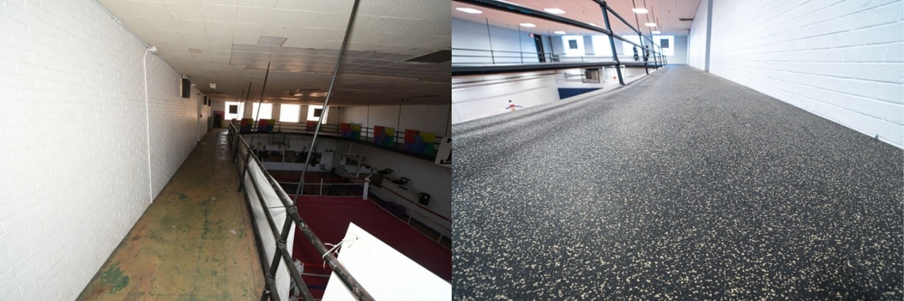 Before, left, and after of the track that runs above the gym.