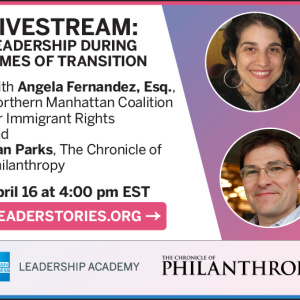 Our conversations are pertinent to the challenges currently facing nonprofit professionals. And, we are thrilled to invite you to be a part of a discussion on Leadership During Times of Transition, featuring Angela Fernandez, Esq., executive director of the Northern Manhattan Coalition for Immigrant Rights, moderated by Dan Parks, managing director of The Chronicle of Philanthropy.