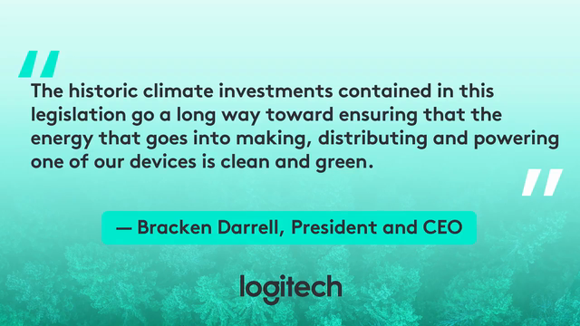 “Companies like Logitech will continue to reduce our own carbon footprint, but to truly address the full lifecycle of our products, we need to have homes, businesses, and manufacturing solutions powered by clean energy. The historic climate investments contained in this legislation go a long way toward ensuring that the energy that goes into making, distributing and powering one of our devices is clean and green.” – Bracken Darrell, Logitech CEO