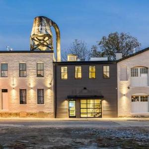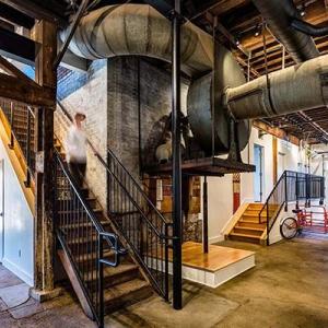 The building was recently placed on the National Register of Historic Places. It retains its industrial character, with exposed ductwork and rafters and a massive steel tank on the roof that once pulled sawdust from the interior. Its brick exterior still displays a fading painted sign that advertised the Hellmann company’s products – lumber, millwork, plywood, wall board. “Steampunk” is how The Cincinnati Enquirer described its look.