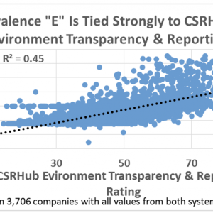 We looked at the E, S, and G pillar scores from Covalence and compared them to the twelve factors that CSRHub generates. We found that Covalence’ E score was tied most strongly to CSRHub’s Environment Transparency & Reporting rating.
