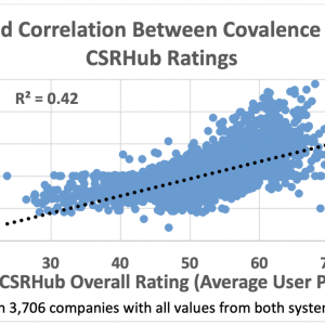 Covalence seeks to incorporate forward-looking analysis into its scores. CSRHub’s ratings are by nature, backwards looking, as they rely on the input of hundreds of expert sources. It was encouraging to see that Covalence’s scores for a particular point in time (October 2020) had a high correlation (42%) with the ratings CSRHub published for that period. (The CSRHub rating was published on December 25.)
