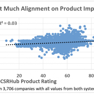 There are some places where Covalence and CSRHub’s systems seem fairly different. For instance, the Covalence Product Impact Rating has a poor correlation with CSRHub’s Product rating.