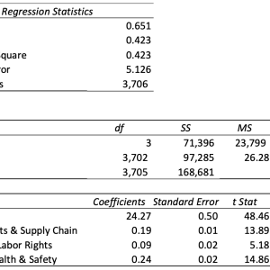 Finally, we compared all six of CSRHub Social area ratings with Covalence’s S score. The following table shows that three of CSRHub’s factors drive more than 40% of the variation in the Covalence score.