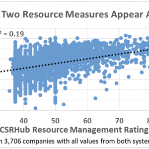 However, Covalence offers other environment-related scores that appear to tie to some of the other factors CSRHub tracks in this area. For instance, Covalence’s Resources Rating has a modest correlation with CSRHub Environment-area Resource Management rating.