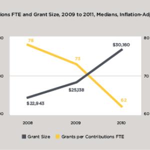 - The number of grants per full-time giving staff person at a company dropped 26% from 2009 to 2011; a median of 8 staff handled 64 grants each in 2011. (page 35)