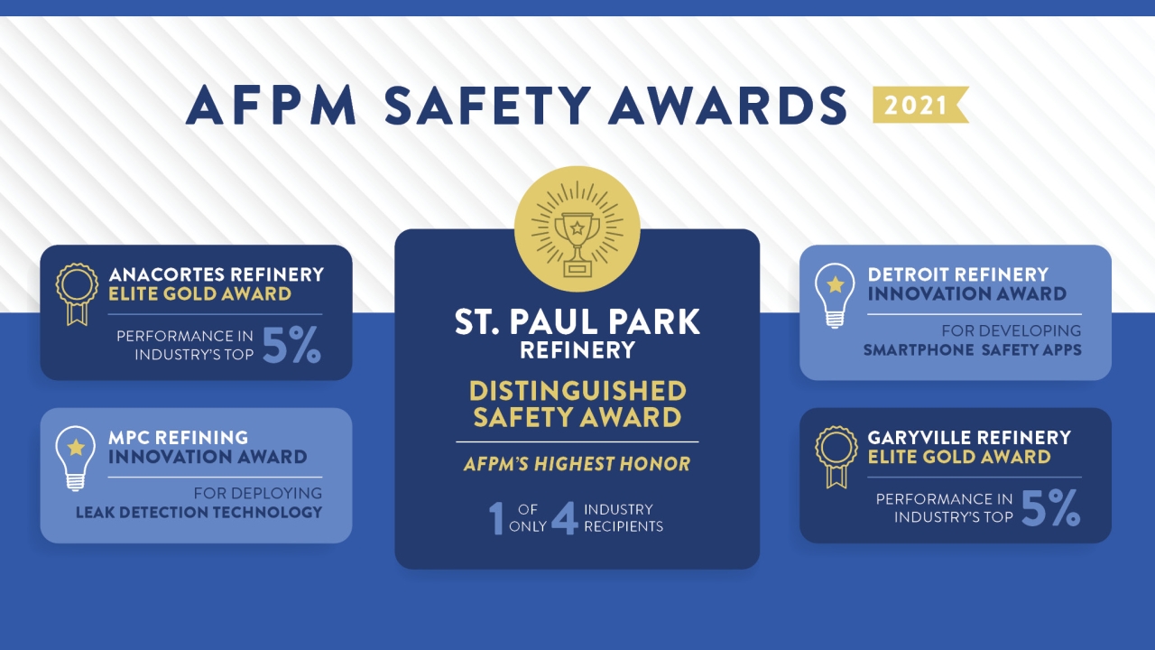 Several Marathon Petroleum Corp. (MPC) refineries have attained a rare industry status through safety performance that earned the highest recognition available from the American Fuel & Petrochemical Manufacturers (AFPM). At the recent AFPM Annual Meeting, the organization acknowledged MPC’s refineries in Anacortes, Washington; Garyville, Louisiana; and St. Paul Park, Minnesota, for performance in 2021 that ranked in the top 1% to 5% of the industry and presented innovation awards to MPC’s Detroit refinery and the company’s refining organization.