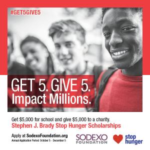 All students that are working to end hunger in their communities are encouraged to apply this year. Winners get a $5,000 scholarship for school and a $5,000 matching grant to give to their hunger charity. Apply by December 5 to #GET5GIVE5 in your hometown. To apply, for more information and official rules, visit SodexoFoundation.org.
