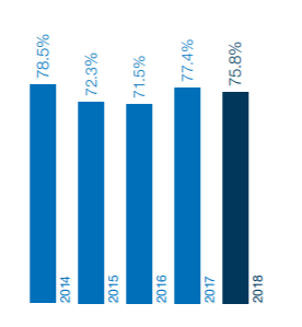 Renewable energy continues to be the dominant source of energy at our three mills as indicated in the three pie charts. In 2018, our total onsite renewable energy use consisted of Black Liquor, 60.7 percent; Biomass, 38.1 percent; and Sludge, 1.2 percent. The bar chart shows the percent of renewable energy for the last five years for comparison purposes. Purchased electricity also includes a renewable contribution and we benefit from the commitments of our regions to increase the amount of renewable energy in the market.