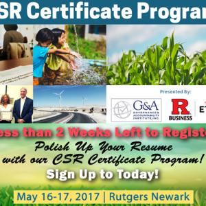 May 9, 2017 /3BL Media/ - On May 16th and 17th, the Rutgers Institute for Ethical Leadership and Governance & Accountability Institute present the Spring 2017 CSR Certificate Program for corporate managers, not-for-profit and foundation managers, and others interested in career opportunities and advancement in the fields of Corporate Social Responsibility (“CSR”), Corporate Citizenship, Corporate Sustainability, Philanthropy, Risk Management, Ethics, and related positions.