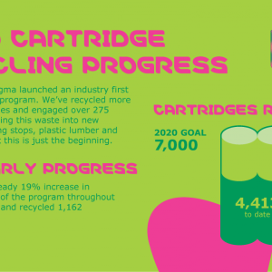 Customers also have the opportunity to recycle their lab water purification cartridges through the ech2o® Cartridge Recycling Program. In 2018, MilliporeSigma saw a 19 percent increase in customer adoption of this program—receiving and recycling 1,162 cartridges. Now, the company has recycled 4,413 cartridges and engaged more than 275 customers in recycling this waste into new products. MilliporeSigma’s goal is to recycle 7,000 cartridges by 2020.