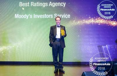 Moody's Brian Cahill with the FinanceAsia Best Ratings Agency Award in Asia for 2018. Moody's Investor Service was recognized for its willingness to engage with the market, commitment to developing new ESG products, accounting for cybersecurity risks in credits and promoting automation.