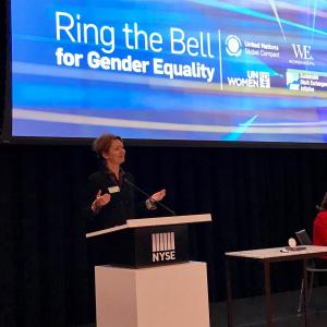 Currently in its fifth year, the Ring the Bell initiative is a collaboration between the UN Global Compact, UN Women, Sustainable Stock Exchanges Initiative, Women in ETFs, World Federation of Exchanges and the International Finance Corporation to raise awareness about the opportunities for the private sector to advance gender equality and sustainable development.