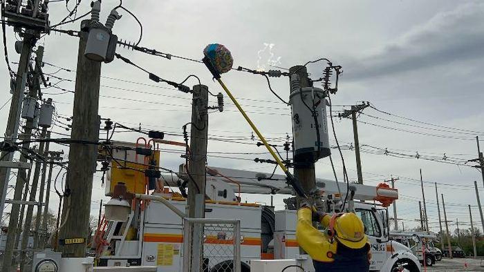 PSE&G lineworkers demonstrate Mylar balloon contact with energized equipment.
