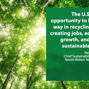 “The United States has one of the lowest recycling rates of any industrialized country, but it doesn’t have to stay that way. The U.S. has an opportunity to lead the way in recycling, while creating jobs, economic growth, and a more sustainable future,” says Nelson Switzer, Chief Sustainability Officer at Nestlé Waters North America. “As a company, we are on a very deliberate journey toward zero landfill waste in our products and operations, so I can think of no better opportunity than working collectively to ensure these recyclable materials are transformed from garbage to the valuable resources that they are.”
