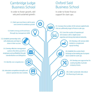 The Saïd and Judge Business Schools have each provided six individual recommendations designed to help the growth of UK businesses. Each recommendation consists of a number of interventions that can be found in the infographic above.