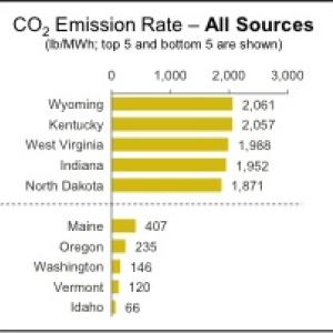 Based on the latest available data, the report also reveals that Wyoming, Kentucky, West Virginia, Indiana, and North Dakota had the highest CO2 emissions per megawatt-hour of power produced, while Idaho, Vermont, Washington, Oregon, and Maine had the lowest CO2 emissions rates. Nationwide, five power producers—American Electric Power, Duke Energy, FirstEnergy, Southern Company, and Tennessee Valley Authority—generate 25 percent of overall electric sector CO2 emissions, though some of these producers and others have significantly reduced emissions in recent years.