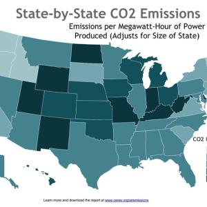 The report shows wide disparities in CO2 emission rates among states. CO2 emissions per megawatt-hour of power produced were found to vary close to twenty-fold among the states, with Kentucky, Wyoming, West Virginia, Indiana, and North Dakota having the highest CO2 emissions rates, and Idaho, Vermont, Washington, Oregon, and Maine with the lowest CO2 emissions rates.