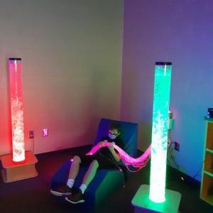 The sensory room contains a wide range of features for students with special needs, from a chair that pulsates along with the beats of music, to a punching bag, swing and trampoline. The room can be darkened as a relaxation tool, while rainbow colors shine from coruscating lights.