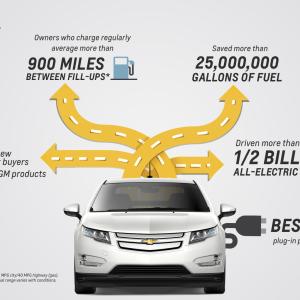 Volt owners are driving more than 63 percent of their overall miles in electric vehicle mode, collectively logging more than 500 million gas-free miles since the Volt’s retail debut in 2010. That has saved more than 25 million gallons of gasoline.