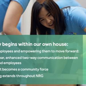 Building a culture of transparency by continuously engaging in dialogue between leaders and employees is important to us. In 2020, management regularly asked our employees for feedback on how they were feeling throughout the COVID-19 pandemic. In response to the feedback received, we instituted work-life initiatives like waiving all fees for tele-health services, partnering with a childcare organization to enhance childcare availability for employees, arranging curb-side pickup of mail and essential technology items from offices to allow employees to work more effectively at home, additional mental health wellness programs — including training to be a Mental Health First Aid responder — and enhanced COVID-19 safety protocols at plants and offices where essential workers continued to work. We continued our annual survey of employees on their physical, emotional, and financial well-being and are addressing issues that surfaced. Finally, we established an ongoing cross-functional learning series called NRG IQ. These are short, virtual sessions hosted by different departments to showcase how each team contributes to our company’s purpose. The series is building our collective knowledge and enabling us to work together more effectively as one NRG.