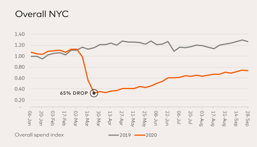 By March, consumer spending at the city’s restaurants had declined by 85 percent. At the same time in Chinatown and Flushing, spending cratered with a 96 percent drop.
