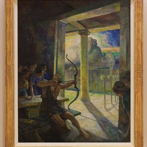 As a star student in the Wilmington school of renowned illustrator Howard Pyle, Wyeth absorbed Pyle's creed that dictated historical accuracy spiced with maximum dramatic effect, and applied it in his own highly successful illustrations for many popular magazines of the period, such as Harper's Monthly or Ladies' Home Journal, as well as his illustrated editions of literary classics such as Treasure Island (1911), The Last of the Mohicans (1919), Robinson Crusoe (1920), and many others. As was standard practice for that era's illustrators, Wyeth would frequently paint the images intended for reproduction in the books. This was also the case with The Trial of the Bow (1929), reproduced as an illustration in George Herbert Palmer's translation of The Odyssey of Homer (1929). This painting captures the critical moment when Ulysses, hiding in disguise among Penelope's suitors, finally reveals himself by shooting an arrow from his own rigid bow, which had failed to yield to anyone else: "Then Ulysses took the bow in his hand, and ...then he bent it, and strung it, and he twanged the string, and the tone of it was shrill and sweet as the cry of a swallow. After this he took an arrow from the quiver, and laid the notch upon the string, and drew the bow to the full, still sitting in his place. And the arrow went straight to the mark."