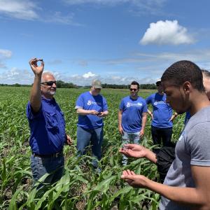 On a nearby field, employees experienced adaptive grazing in action and intercropping in standing corn. Both practices are used to capture carbon in the soil and help keep the soil where it belongs – on the fields.